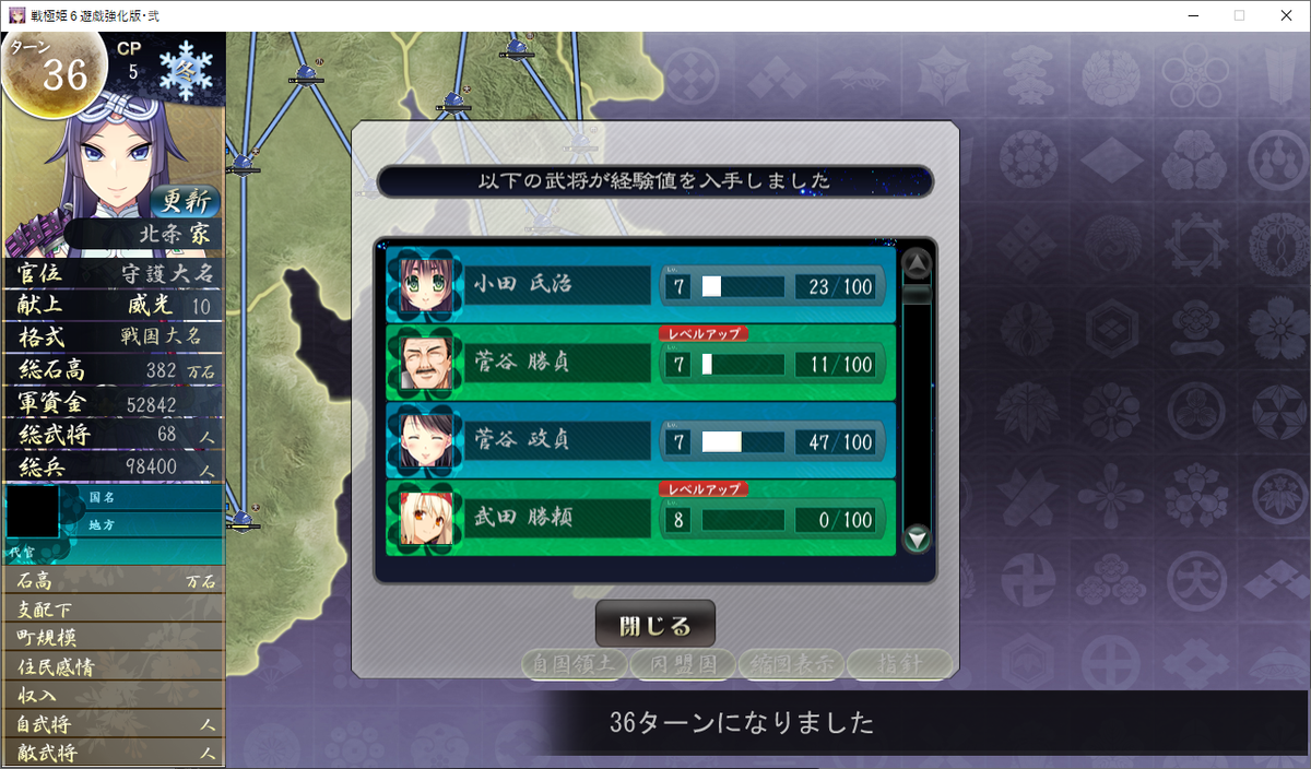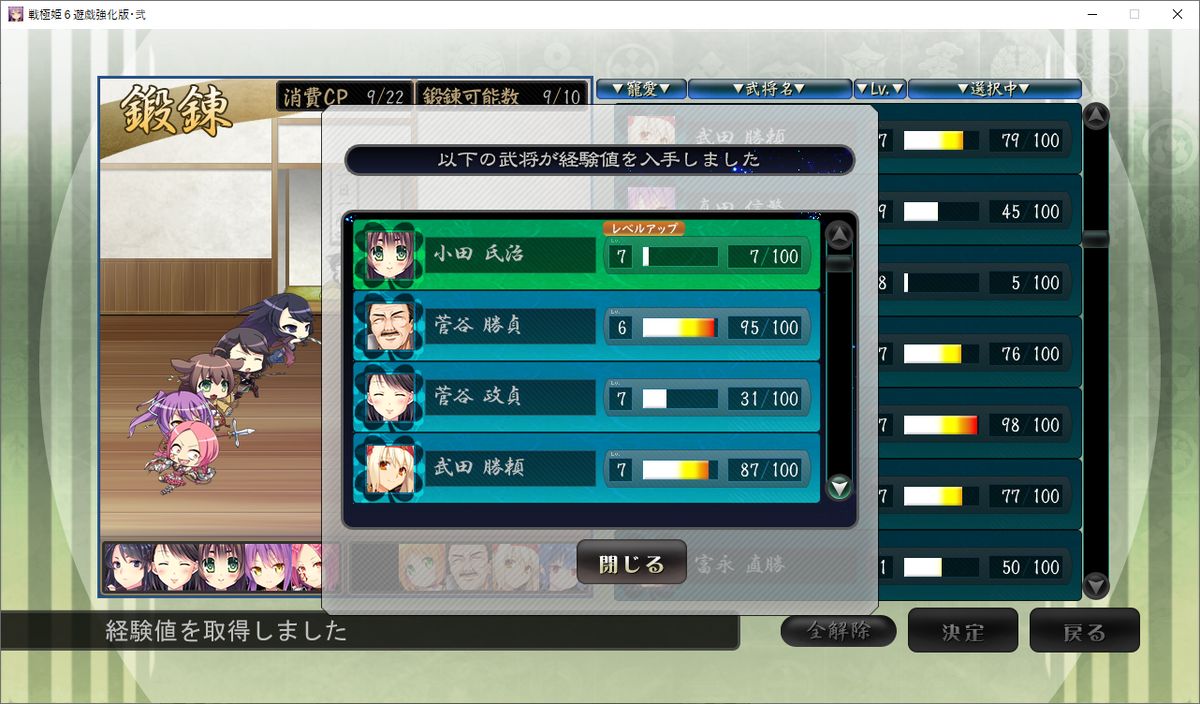 鍛錬で小田氏治がレベル7、筧十蔵がレベル8になりました。