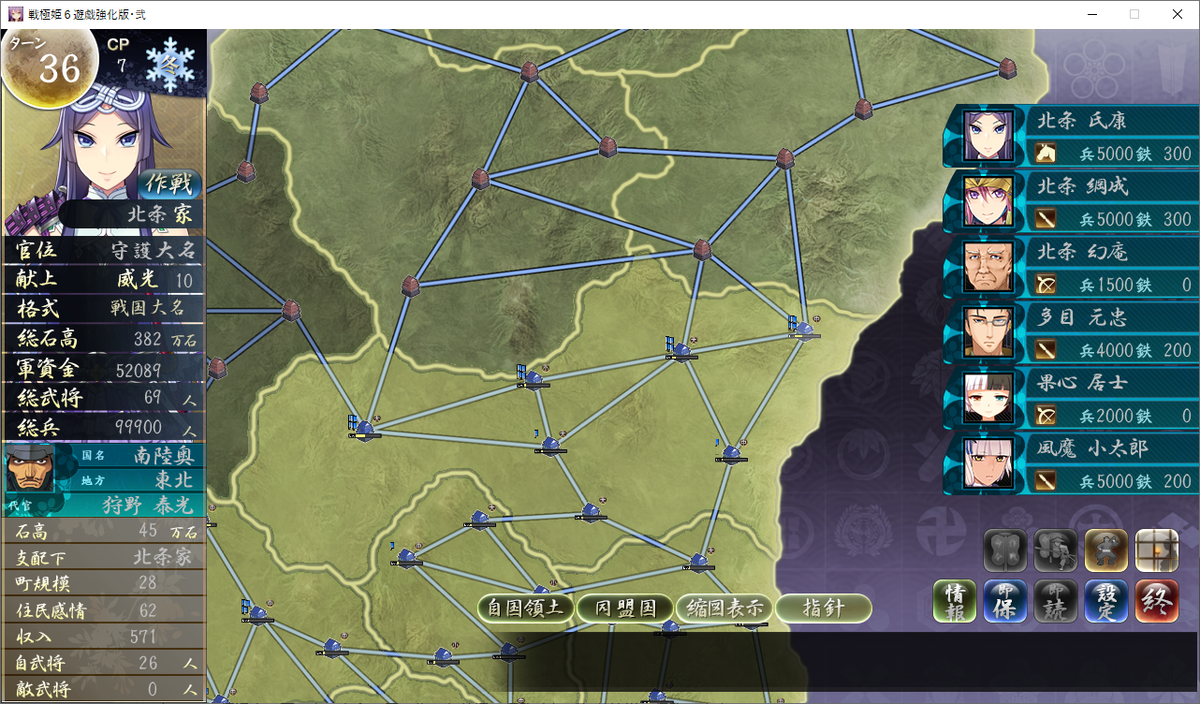 36ターン目から新たに侵攻可能国とした開放された「北陸奥、中陸奥、北出羽、南出羽」の4ヶ国」へ侵攻を開始します。