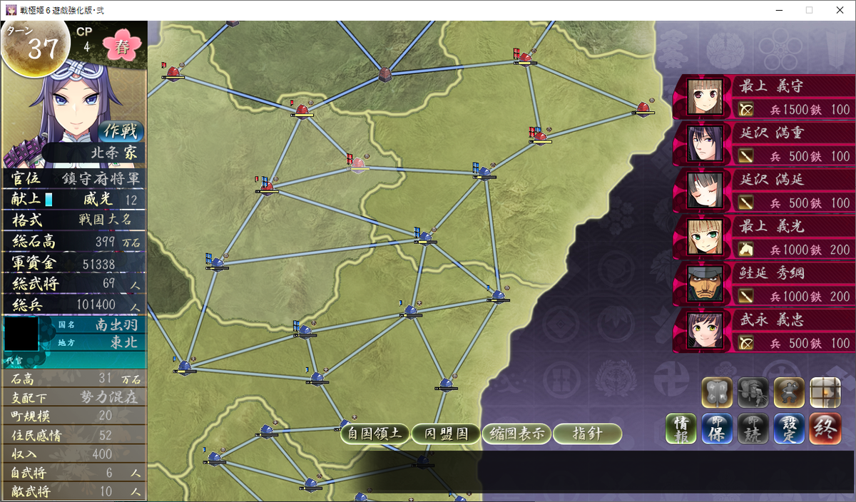 このターンで北陸奥、北出羽へと侵攻開始、南出羽をさらに制圧します。
