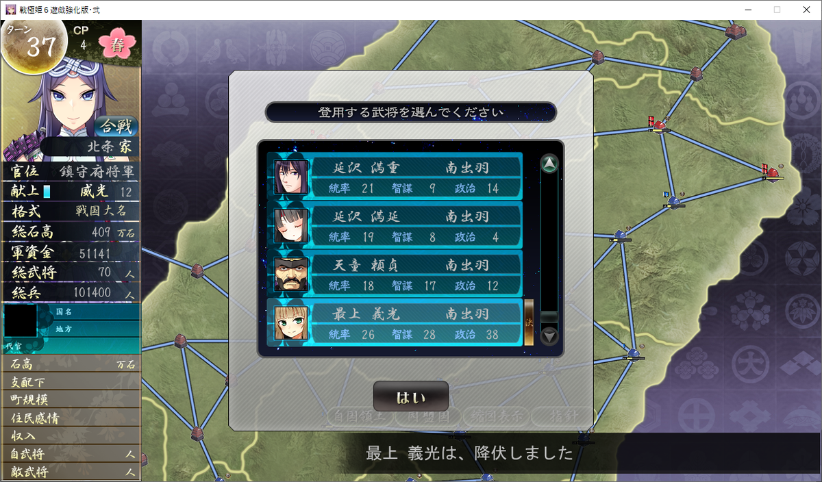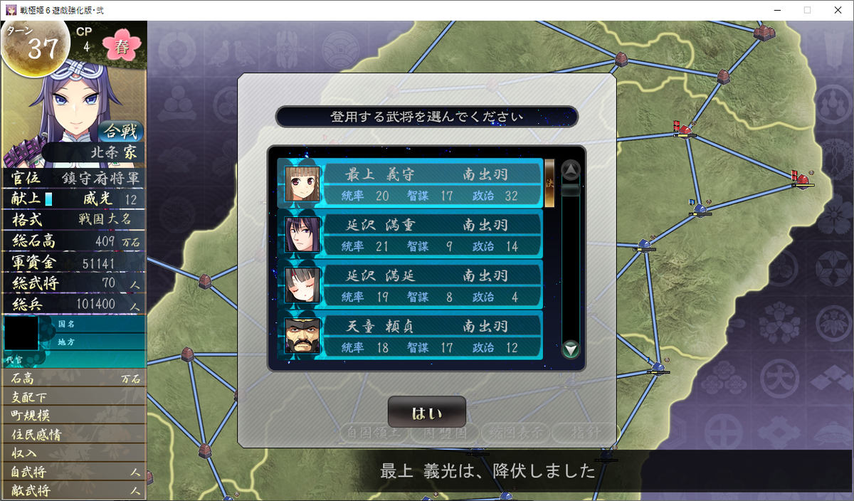 36ターン目から新たに侵攻可能国とした開放された「北陸奥、中陸奥、北出羽、南出羽」の4ヶ国」へ侵攻を開始します。
