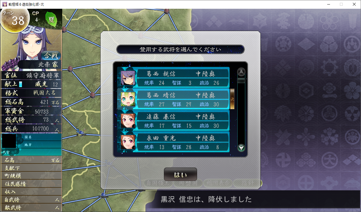 新加入した4人は「富国強兵」のスキルを持ち、石高の高い上野や武蔵で徴兵すると良いでしょう。