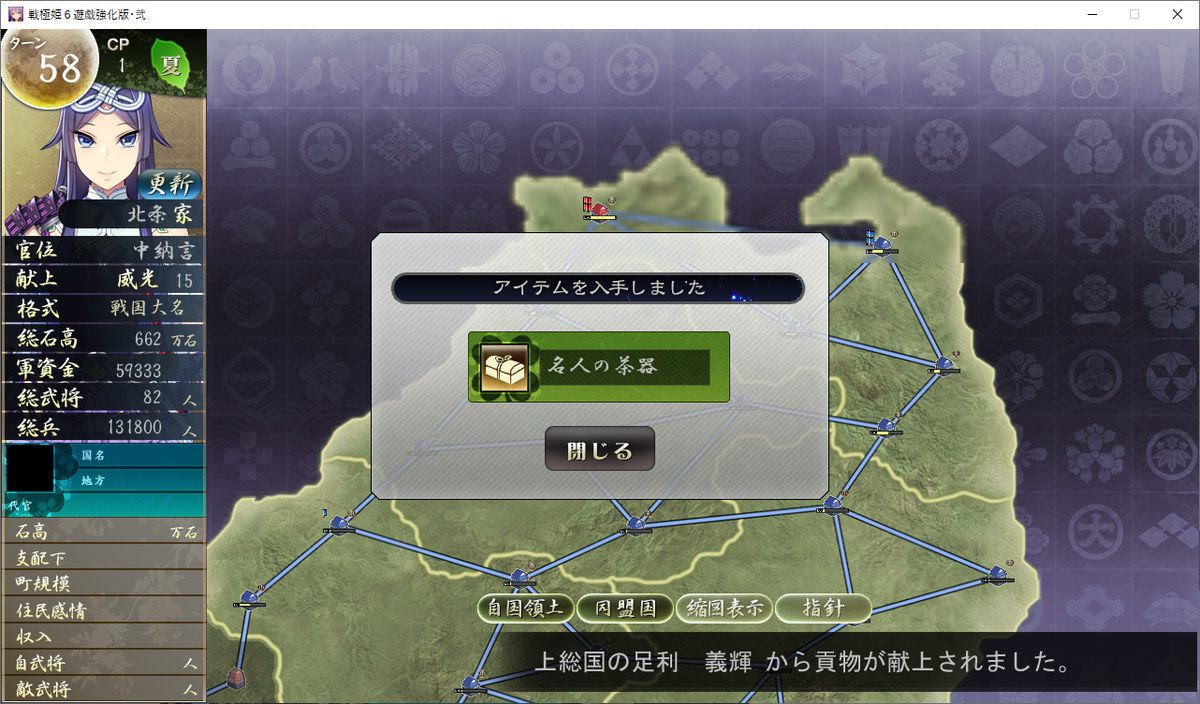 久しぶりに朝廷の使者が来て、「中納言」の官位、威光が15となりました。