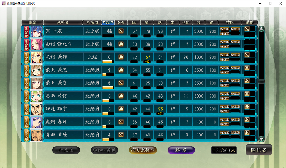 なお、統率の素の値が最高なのはボーナス効果でアップした月冴を除けば、塚原卜伝の89が最高値です。