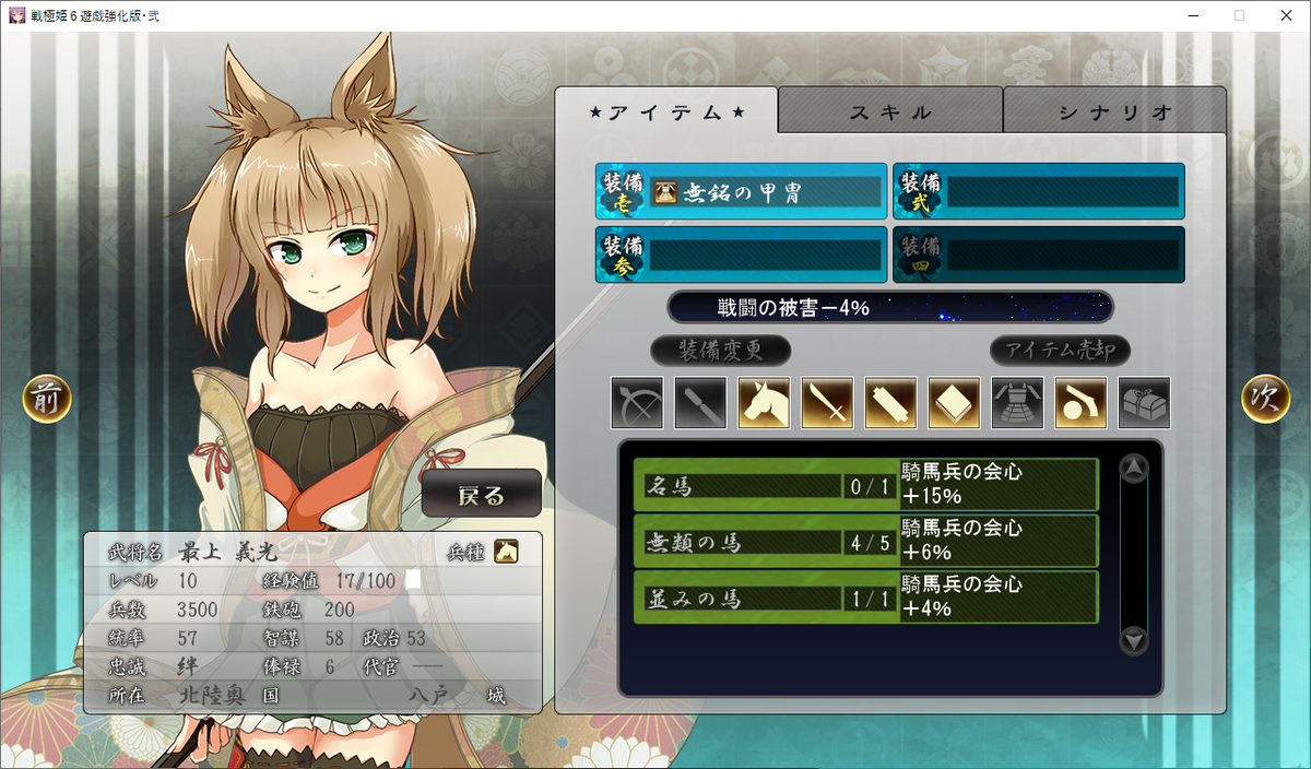 童子切安綱の効果で智謀が+10されて、統率86とトップクラス、智謀も底上げされて70と野戦に申し分ない能力値に仕上がっています。