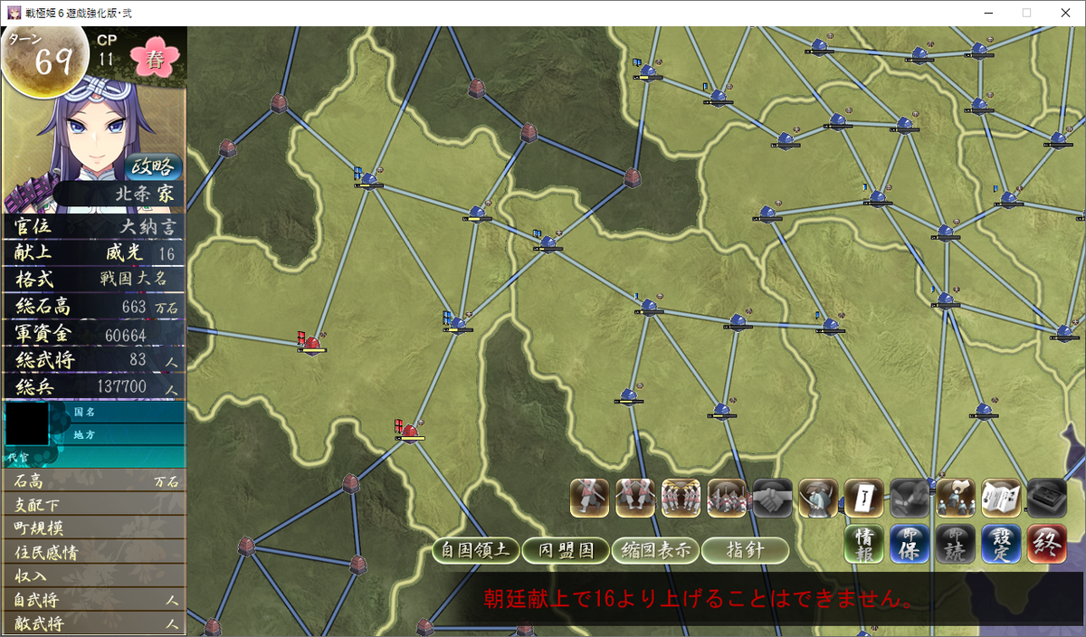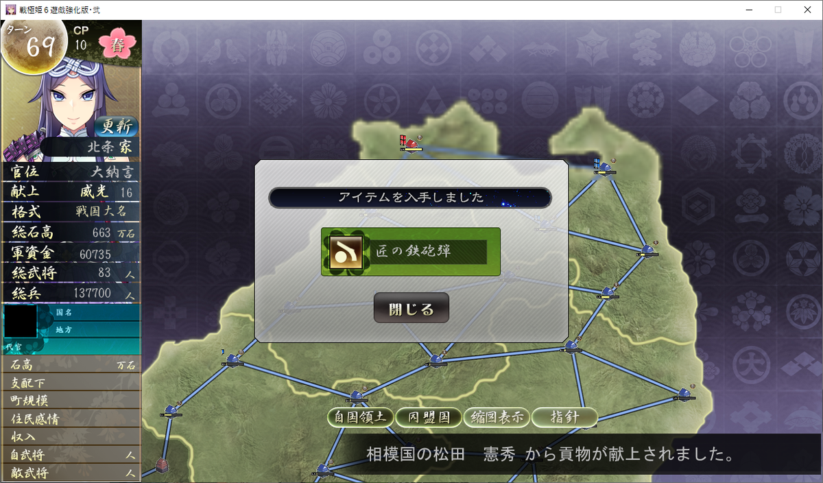 更新フェイズで、朝廷の使者が来て「大納言」の官位をもらって威光が16になりました。