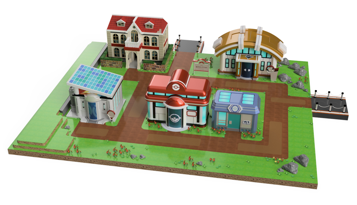 ポケモン屋敷と、その周囲塀を配置して、次の段階として自然物配置を進めます。