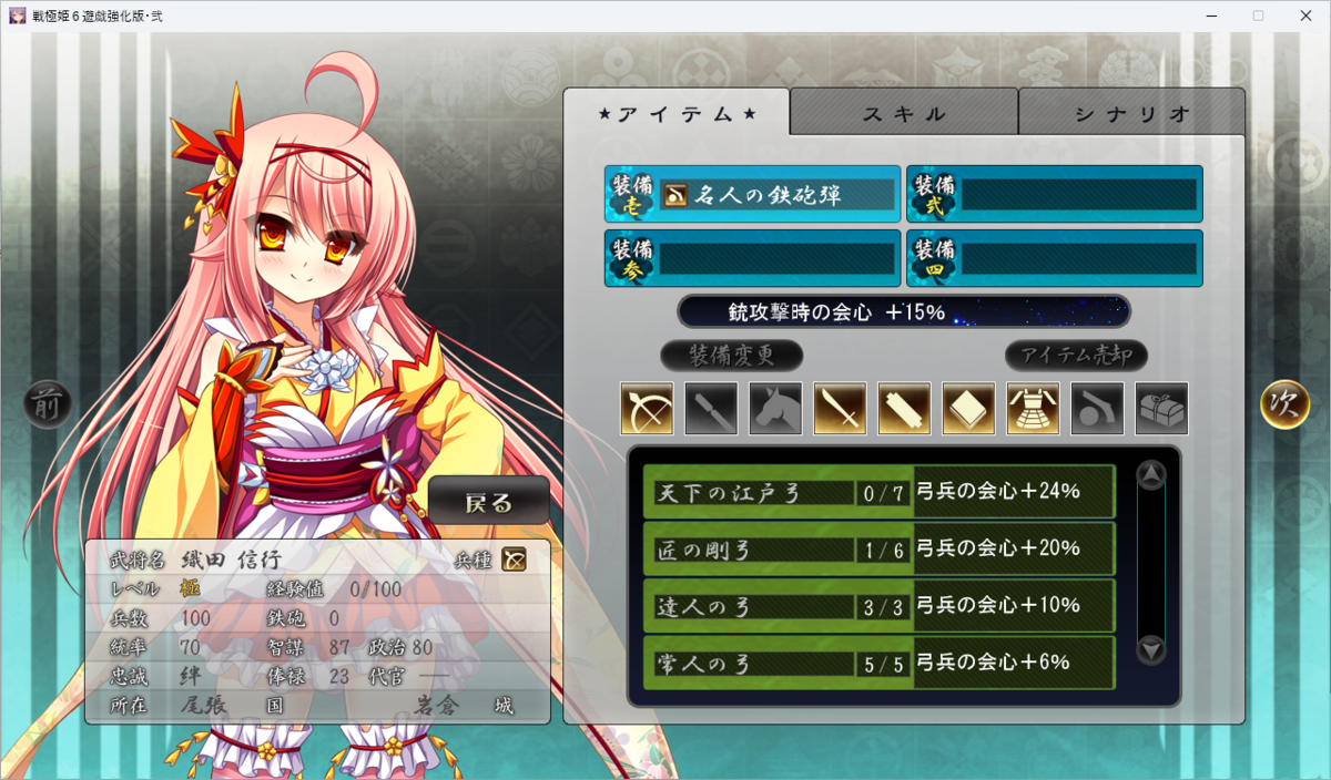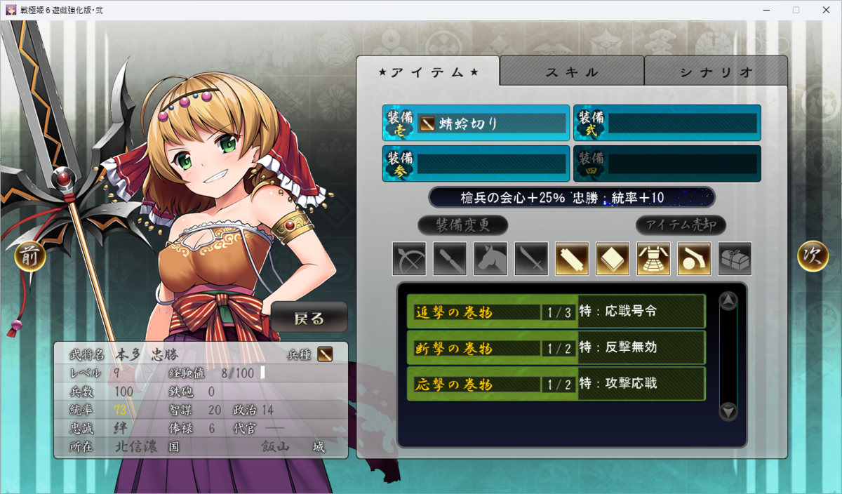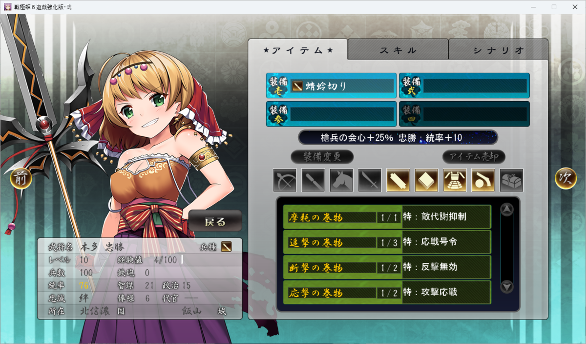 このルートでは使いませんが、武田勝頼ルートでは野戦が多く、相手が強いので摩耗の巻物がないとかなりきつくなります。