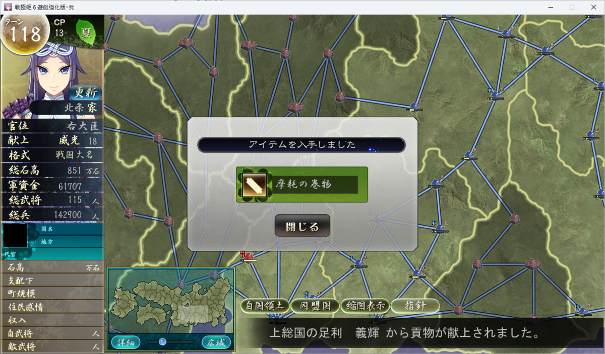 このターンで久しぶりの朝廷の使者が来て、左大臣の官位、威光が19になりました。