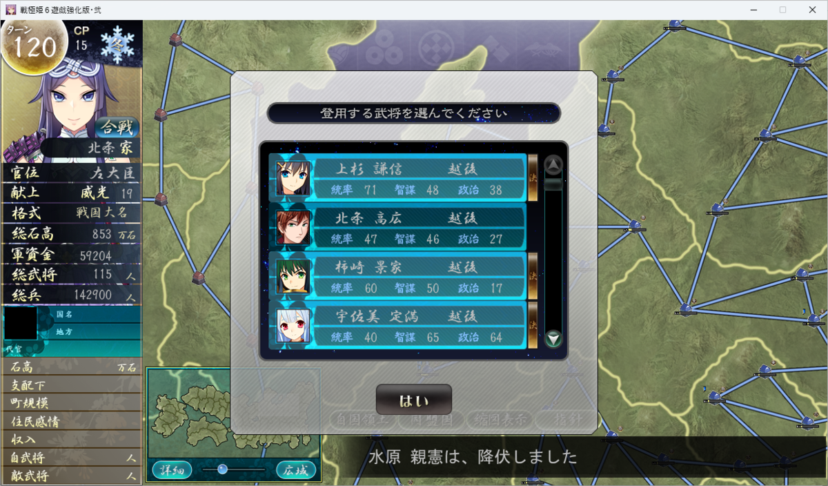 既に上杉謙信はレベル10、他の柿崎景家や宇佐美定満もレベル9以上なので降伏させてレベリングします(もちろん上杉家ルートもクリア済みなので不要。ついでです)。